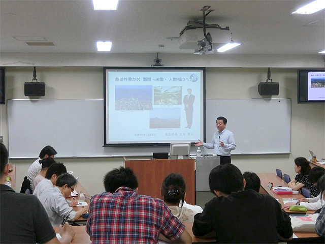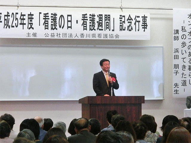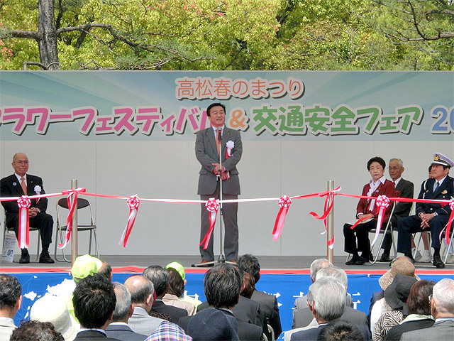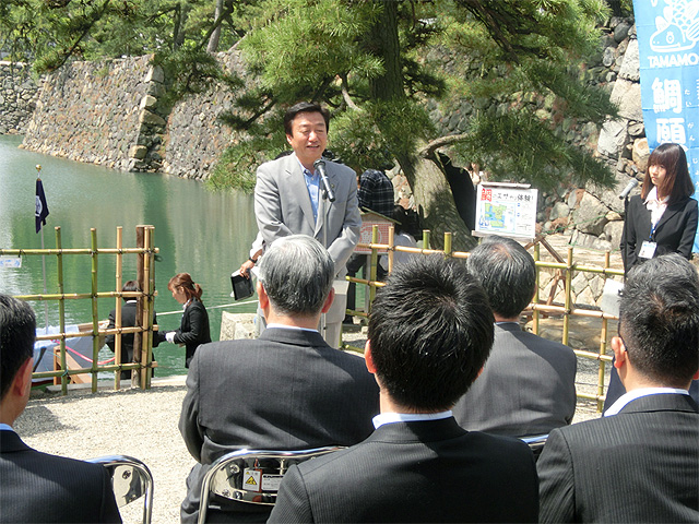 玉藻公園は、城下町高松のシンボルである史跡高松城跡を整備したものです。昨年7月に、公園内の「披雲閣」が国の重要文化財の指定を受け、今年3月には天守台石垣の改修工事が完了するなど、改めて歴史的価値が高くなってきております。そして堀には瀬戸内海の海水を引き込んでおり、海と同様たくさんの海水魚が泳いでおります。「玉藻丸」と任命された和船は、その堀内を周遊するもので、1640年代中頃の高松を描いたとされる「高松城下図屏風」にある和船をモデルに製作されたものと伺っております。和船の就航が、高松城の最大の特徴である海城(うみじろ)を体験できる機会となるとともに、放流された稚魚が大きくなって、和船と共に、訪れた多くの皆様を楽しませてくれることを期待しております。