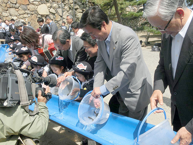 本日午前、玉藻公園において、この度、松平公益会から本市に御寄贈いただいた和船の贈呈・任命式ならびに真鯛の稚魚の放流式を行いました。