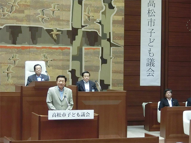 12日に開幕した高松まつりも本日クライマックスの総おどりを迎え、私も2人の副市長とともに、高松市役所連の一員として、本市のメインストリート「中央通り」を踊り歩きました。 今年の総おどりには、一元放送連と自由連をあわせ、54連、約3,700人の踊り子が参加し、今年のテーマ「つなげよう!明るく楽しく『ものっそ高松』」のとおり、どの連もチームワークよく、弾ける笑顔と踊りで沿道の観客を魅了したのではないでしょうか。我らが市役所連も総勢110人が一丸となり、元気溢れる踊りを披露することができました。また、総おどりの前に行われた「東京ディズニーリゾート